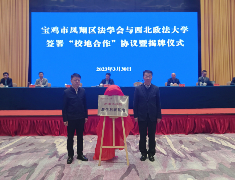 我校刑事法学院副院长刘仁琦教授与郭亚波共同签署《凤翔区法学会与西北政法大学刑事法学院关于成立“法治凤翔与社会治理研究中心”的合作框架协议》。
