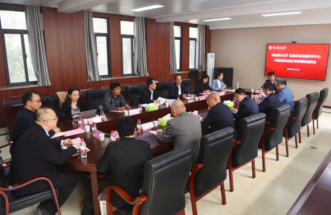 4月12日,由中国法制出版社副总编辑闫光永带队,司法部办公厅庞继书,全面依法治国研究中心研究员庄春英、曲广娣,中国法制出版社编辑马颖、宋平为成员的调研组来校调研。校党委书记孙国华出席座谈会并致辞,副校长王健主持座谈会。