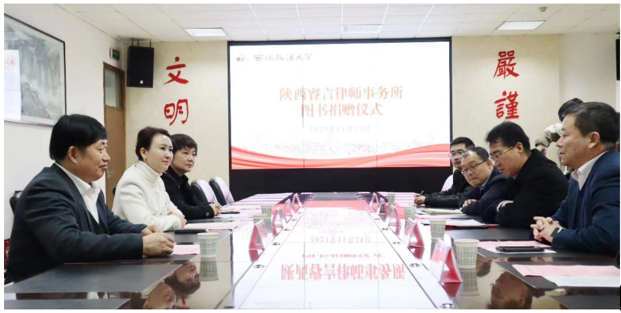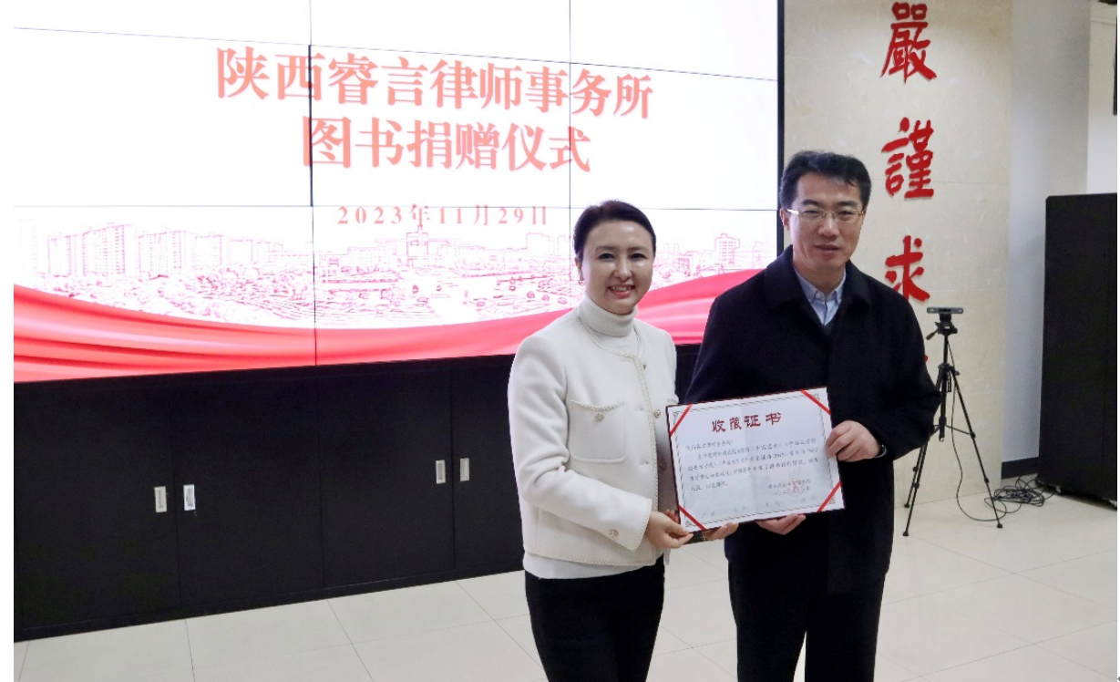 11月29日上午,陕西睿言律师事务所图书捐赠仪式在我校长安校区图书馆一楼会议室举行。副校长张军政、陕西睿言律师事务所管委会主任兼执行主任张萌、副主任魏亚楠、李水民参加,捐赠仪式由图书馆馆长张宏斌主持。