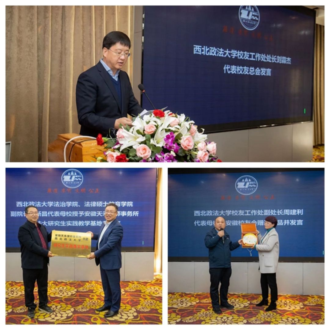 学校校友总会秘书长、国内合作与校友工作处处长刘霖杰宣读了《关于西北政法大学安徽校友会理事会换届的批复》,法治学院 法律硕士教育学院副院长淡新昌代表学校向安徽天禾律师事务所颁授了“共建研究生实践教学基地”铜牌,国内合作与校友工作处副处长周建利代表学校和校友总会向安徽校友会赠送了专属文创瓷盘。