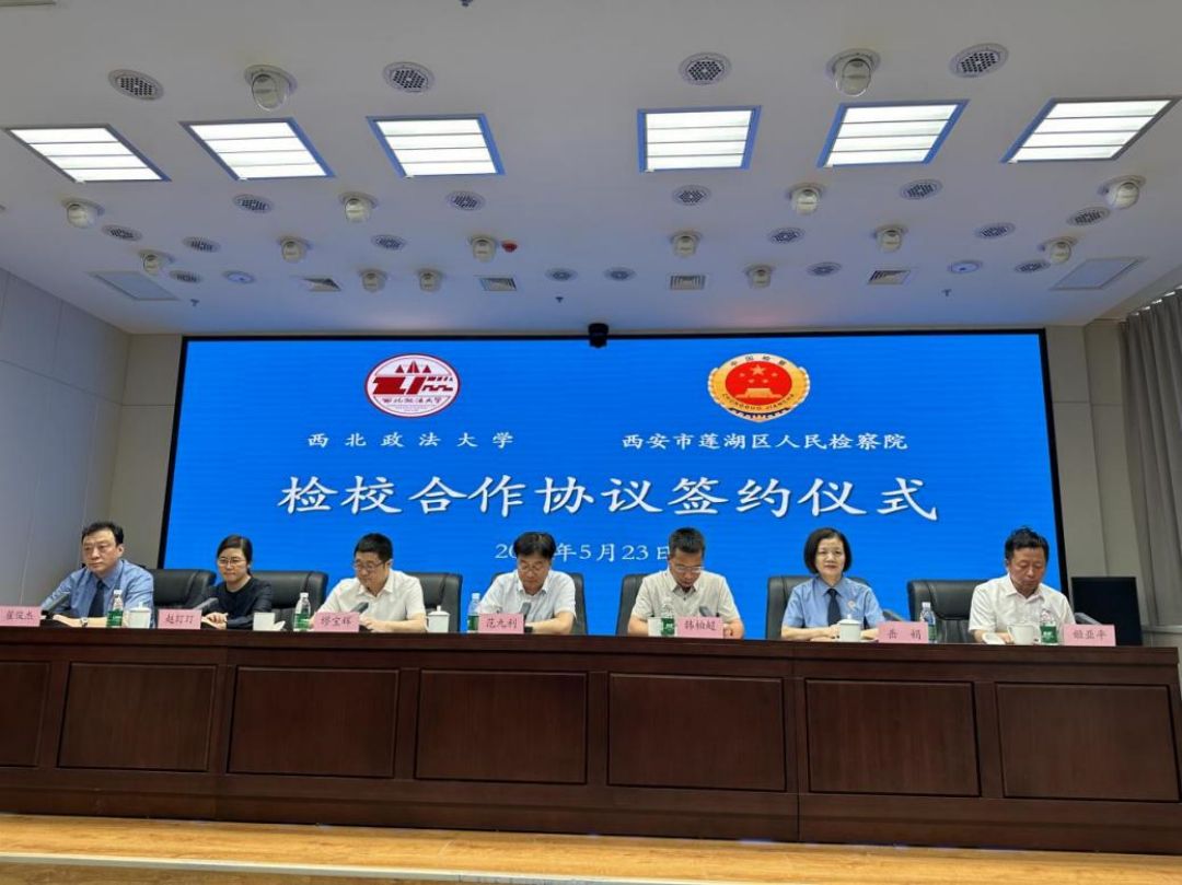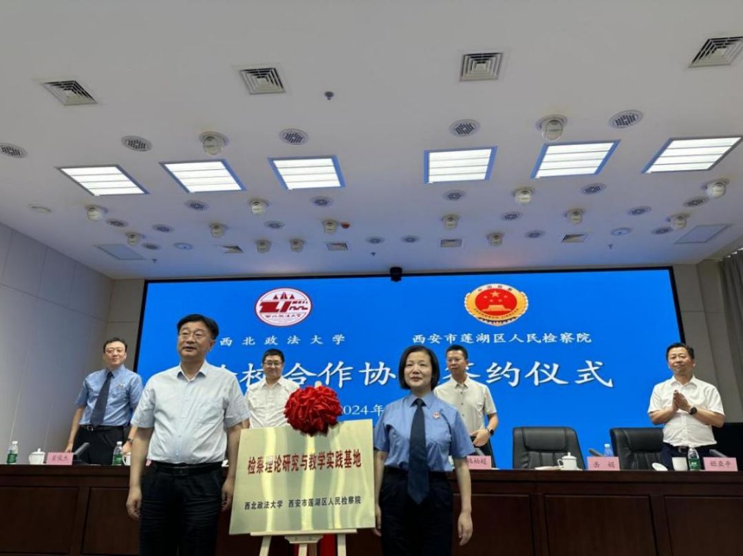 为加强法学理论与检察实践深度融合,积极推进检校合作,5月23日,我校与西安市莲湖区人民检察院在莲湖区检察院举行检校合作签约仪式,共同签署检校合作战略协议书,为“检察理论研究与教学实践基地”揭牌。我校校长范九利,西安市人民检察院党组成员、副检察长韩柏超,西安市莲湖区委常委、政法委书记缪宝辉,西安市莲湖区人民检察院党组书记、检察长岳娟及有关领导出席签约仪式。