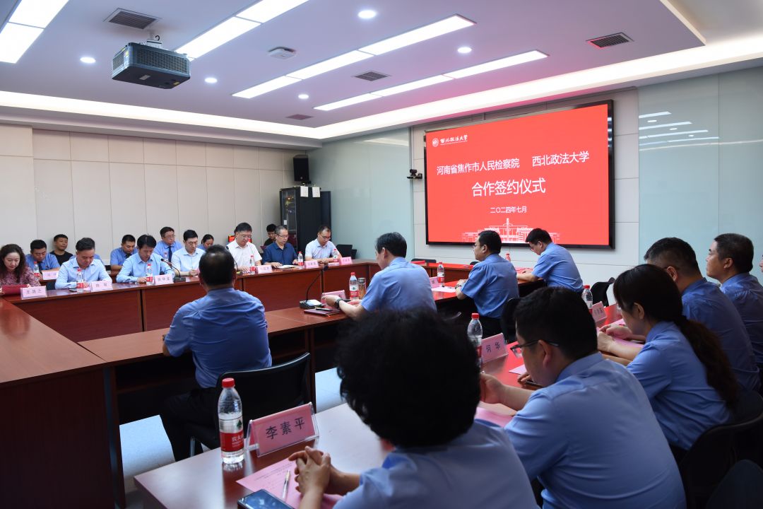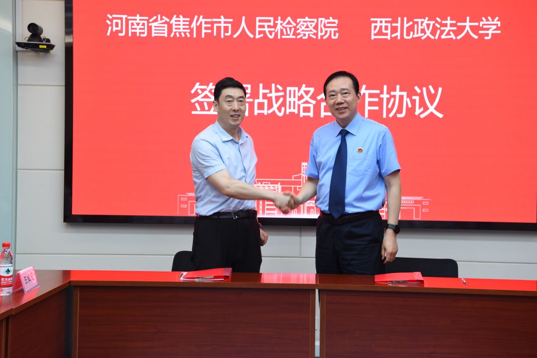 为加强检校合作,促进法学理论与检察实践的深度融合,7月23日,我校与河南省焦作市人民检察院举行检校合作签约仪式。我校副校长孙昊亮,焦作市人民检察院党组书记、检察长刘宏东出席签约仪式。仪式由法治学院 法律硕士教育学院党委书记张学龙主持。