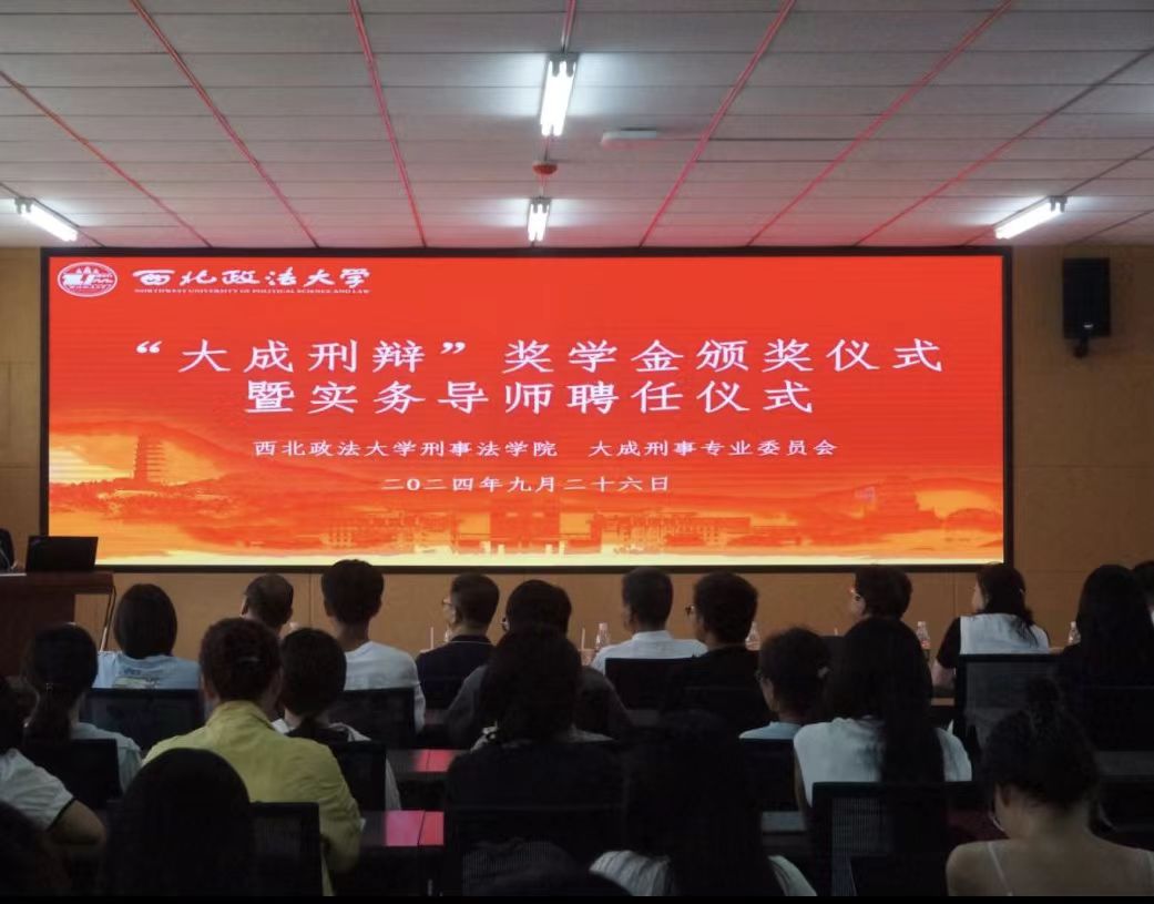 9月26日,“大成刑辩奖学金”颁奖大会在我校长安校区5号楼举行。校党委副书记郭武军,北京大成律师事务所高级合伙人、北京大学刑法学博士韩友谊,北京大成刑委会理事、洛阳办公室刑事组负责人王怡飞,大成刑委会联合牵头人、西安办公室董事赵叶红,学工部相关负责人,刑事法学院党政领导出席仪式。