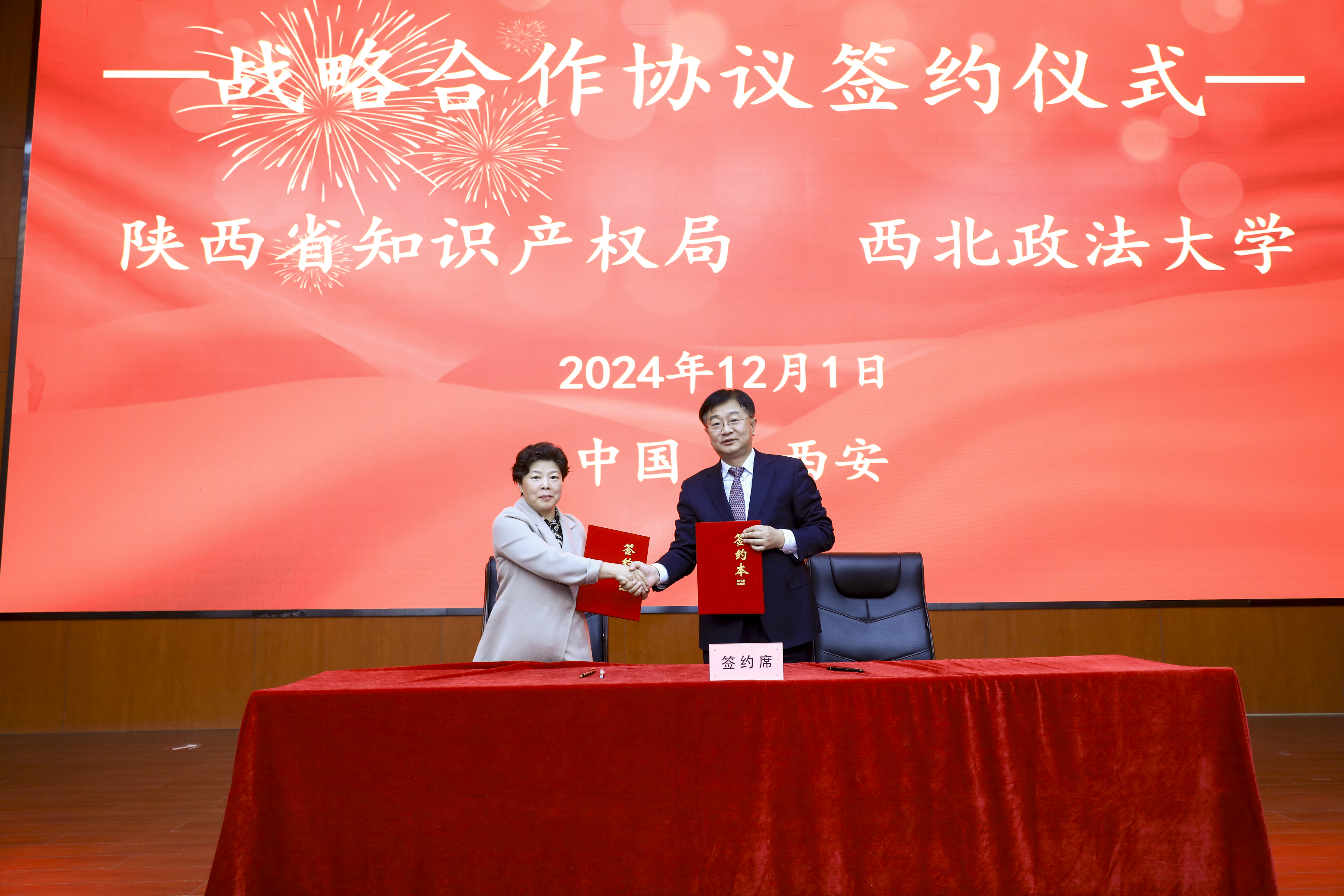 会议举行了陕西省知识产权局和我校战略合作协议签约仪式,双方将联合建设“陕西知识产权法治研究院”,共同打造知识产权高水平研究平台。