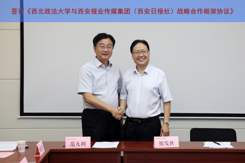 9月14日,西北政法大学与西安报业传媒集团(西安日报社)校媒合作协同育人战略合作研讨会在雁塔校区会议室举行。西安报业传媒集团(西安日报社)总经理缑发世、副总经理李明,我校校长范九利出席会议,西安报业传媒集团(西安日报社)部门负责同志、我校新闻传播学院党政领导及教师代表参加会议。研讨会由新闻传播学院党委书记刘渊主持。
