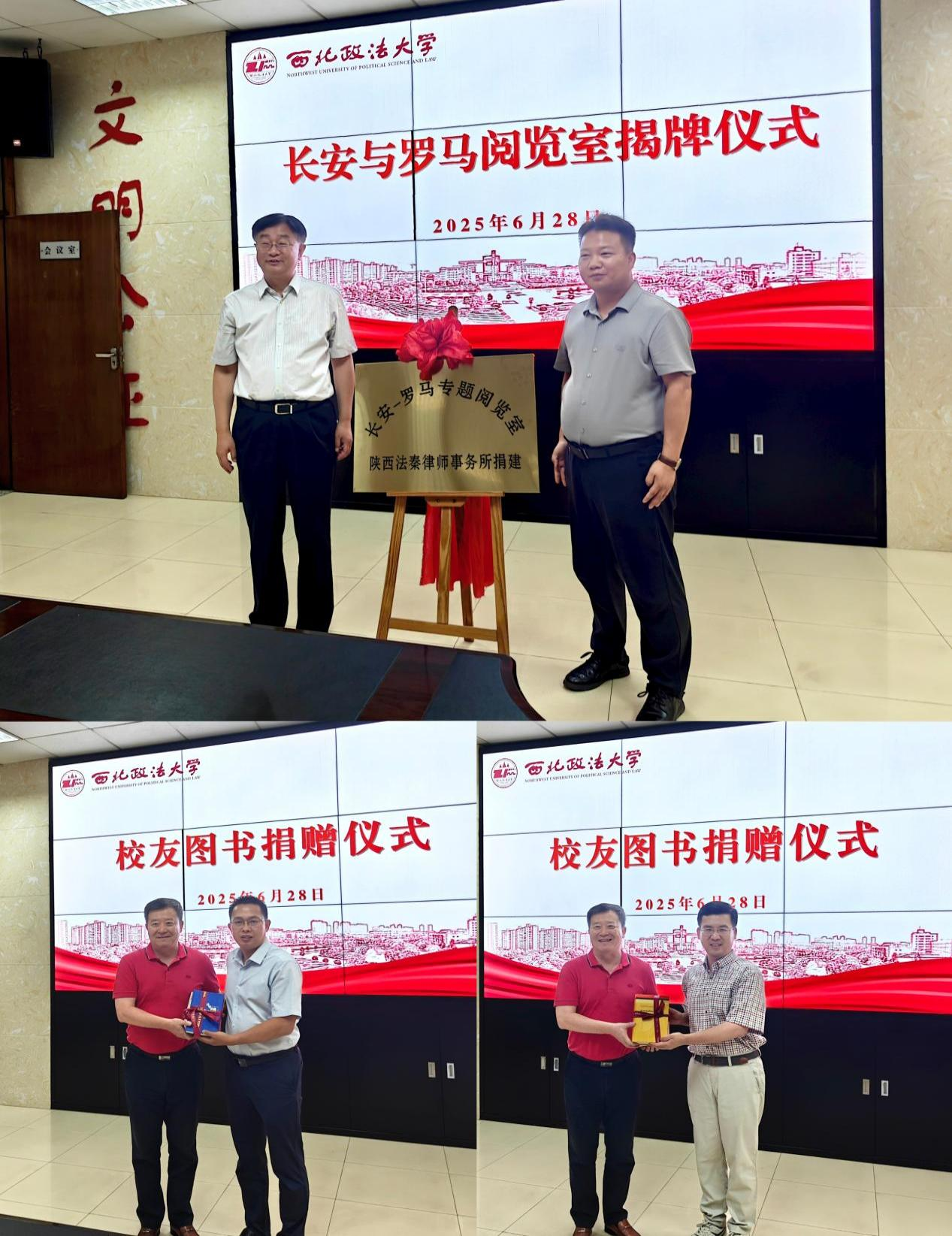 2001级校友刘跃挺此次代表德中人文社科联合学术研究中心国际学术委员会向图书馆捐赠外文及港台图书共计1500余册,他在致辞中介绍了德中人文社会科学国际联合学术研究中心推动中德学术交流的成效,期待未来加强与母校在学术交流、人才培养等方面的合作。1998级校友何平此次向母校捐赠图书共计500余册,他深情回忆了在母校求学的难忘时光。他表示,此次捐赠是表达对母校多年培养的感恩之情,希望为母校的建设发展贡献自己的力量。陕西法秦律师事务所此次捐赠人民币10万元用于图书馆“长安与罗马图书阅览室”建设,该所主任孙佺表示,律所的成长离不开学校的大力支持,今后将持续为西北政法大学的建设发展提供服务和支持。