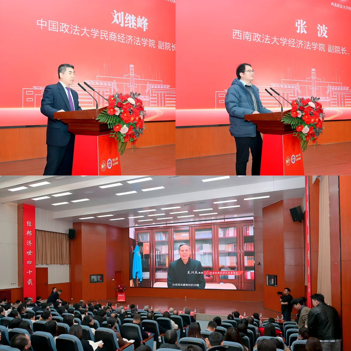 中南财经政法大学原校长吴汉东教授视频送祝福,中国政法大学民商经济法学院副院长刘继峰教授、西南政法大学经济法学院副院长张波副教授代表各自学院宣读贺信,送上诚挚祝福。