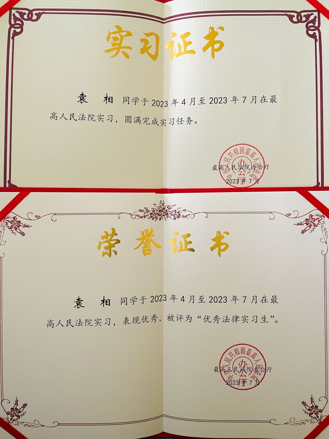 7月27日下午,最高人民法院召开第十二批法律实习生实习期满座谈会。经最高人民法院政治部严格选拔、层层推荐,我校国际法学院2021级国际法学专业硕士研究生袁相荣获最高人民法院第十二批“优秀法律实习生”称号。