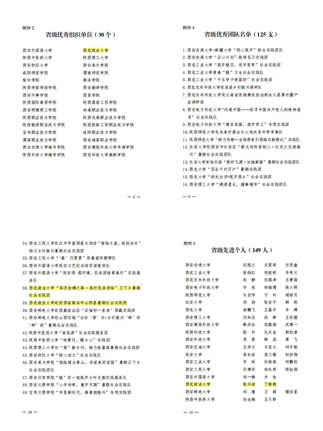 我校荣获“省级优秀组织单位”称号,我校“‘探寻丝绸之路·践行民族团结’三下乡暑期社会实践团”“赴陕西省商洛市山阳县暑期社会实践团”荣获“省级优秀团队”称号,张兴浩、丁艳艳两位老师荣获“省级先进个人”称号。