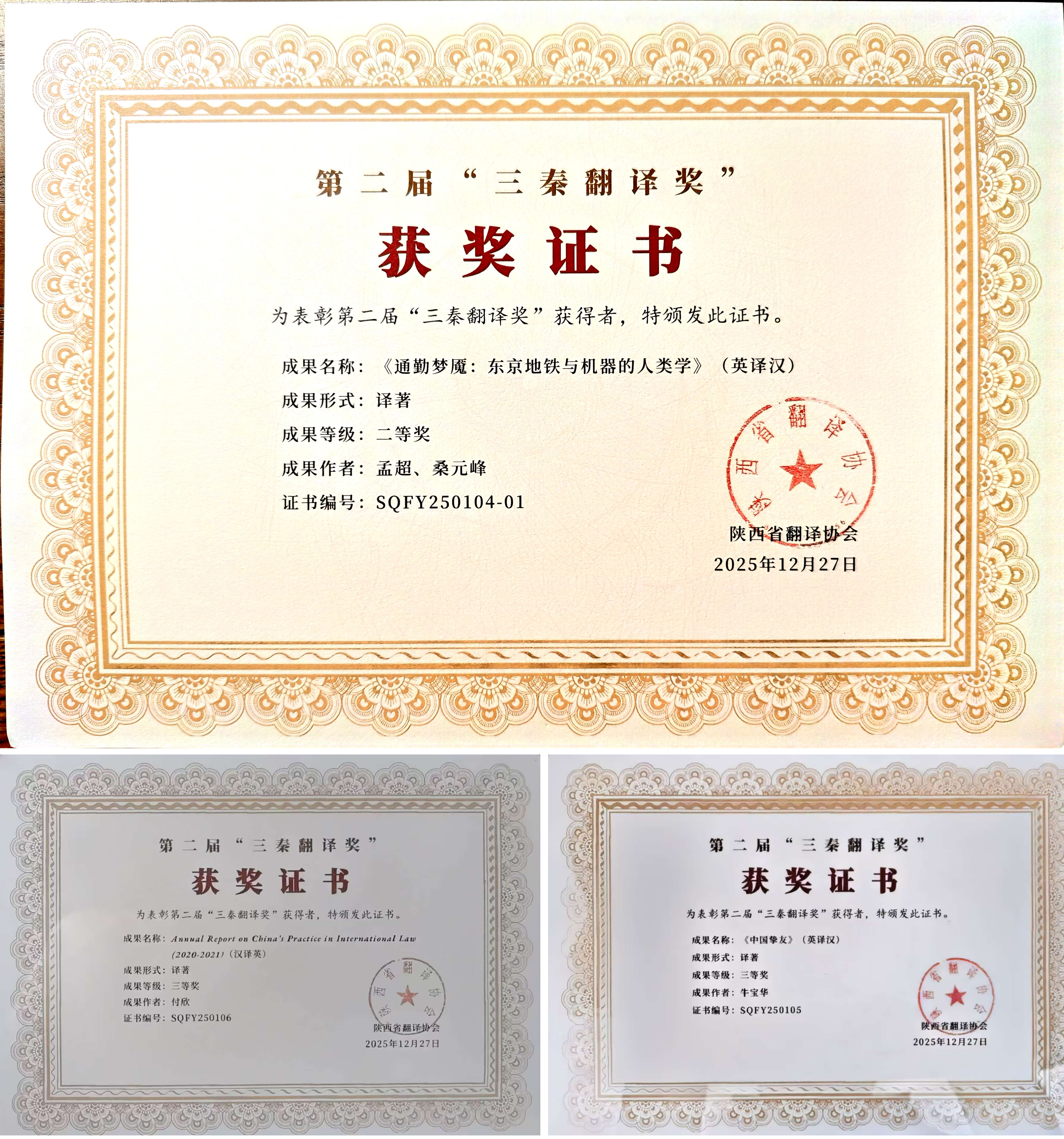 近日,陕西省翻译协会第九届理事会第六次会议暨学术年会正式揭晓第二届“三秦翻译奖”获奖名单,我校外国语学院孟超博士合作译著《通勤梦魇:东京地铁与机器的人类学》荣获二等奖,牛宝华副教授合作译著《中国挚友》、付欣副教授译著《Annual Report on China’s Practice in International Law(2020-2021)》荣获三等奖。“三秦翻译奖”是陕西省翻译界的最高奖项,本次获奖彰显了外国语学院在翻译领域的扎实功底。