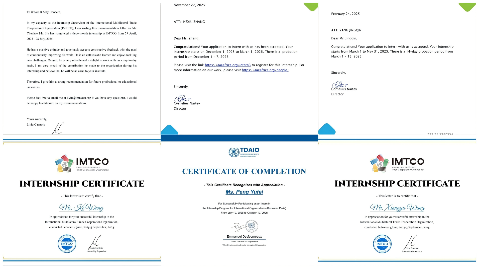 我校学生2025年非洲企业家协会、国际多边贸易合作组织、国际组织人才发展学会实习录取信及证书
