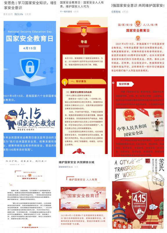 2021年4月15日是第六个全民国家安全教育日,为贯彻落实“总体国家安全观”,增强师生国家安全意识,值此建党100周年之际,根据学校有关要求,新闻传播学院党委精心组织了一系列国家安全教育活动,不断提升学院师生国家安全意识,筑牢国家安全防线,营造庆祝建党100周年的良好氛围,号召大家为实现“两个一百年”奋斗目标、实现中华民族伟大复兴的历史伟业筑牢安全保障,贡献青春力量。