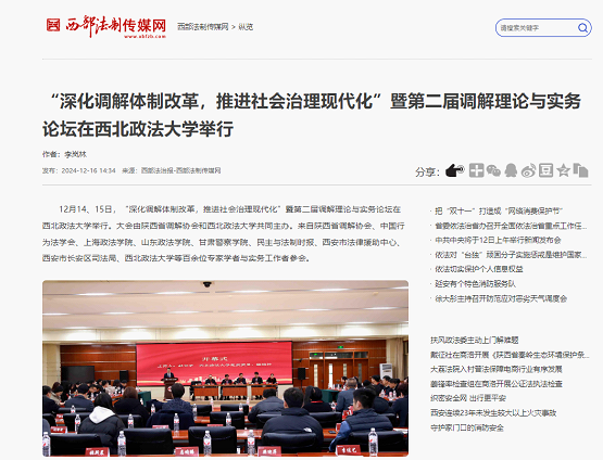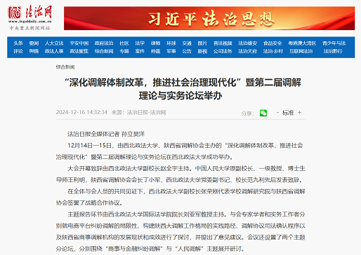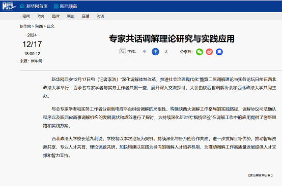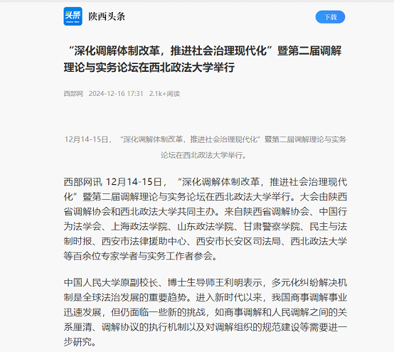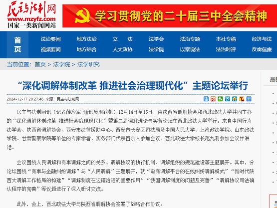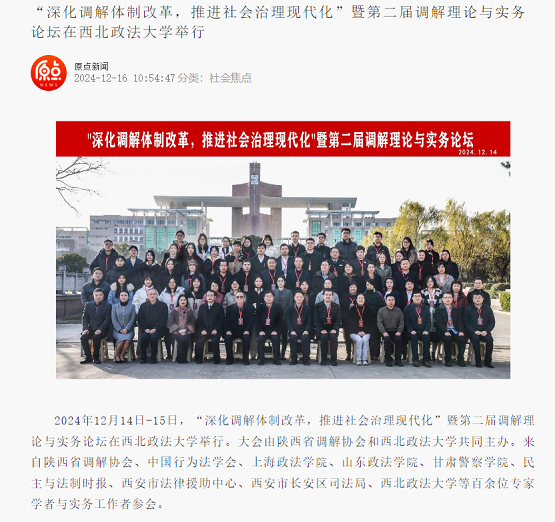 1217日,人民网以《陕西省第二届调解理论与实务论坛在西北政法大学举行》为主题进行新闻报道。新闻记者表示,在本次论坛上,多位专家围绕调解的热点议题,结合丰富的实务经验进行了深入剖析与探讨,共同为调解事业的进步贡献智慧与力量。