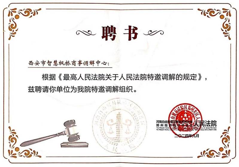10月16日上午,智慧枫桥商事调解中心收到河南自由贸易试验区郑州片区人民法院的聘书,正式成为该法院的特邀调解组织。作为西北政法大学调解研究院九大中心之一,智慧枫桥商事调解中心自成立以来,在调解研究院副院长、中心主任张荣格的带领下,一直致力于民商事纠纷的高效、专业调解,为众多法院输送优秀的调解员,赢得广泛赞誉。