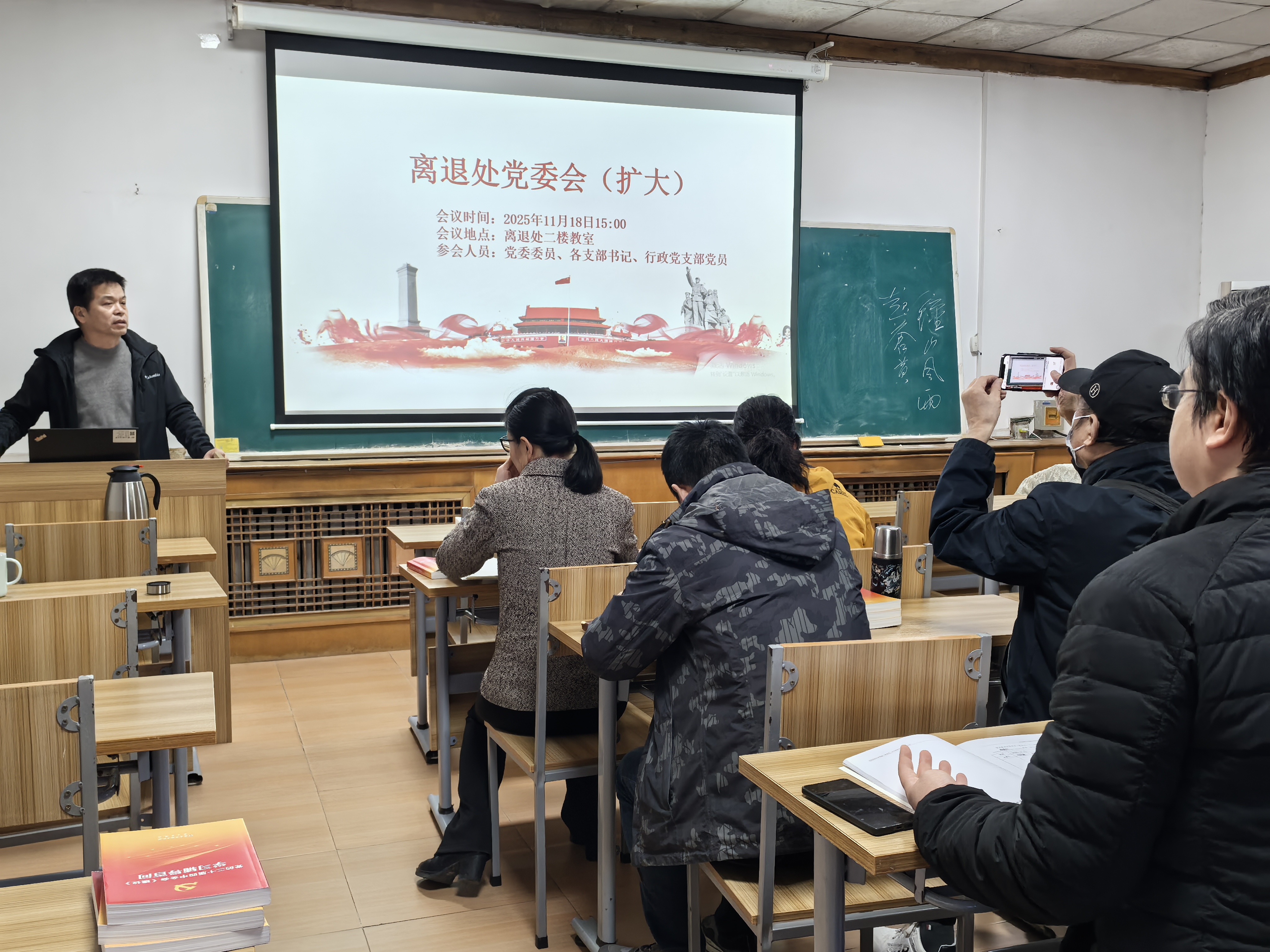 11月18日下午,离退处党委组织召开理论学习中心组(扩大)会议,专题学习党的二十届四中全会精神。会议由处党委书记陈永康主持,党委委员、各支部书记及行政党支部党员参加学习。 会议强调,党的二十届四中全会是在迈向第二个百年奋斗目标的关键时期召开的一次重要会议,其审议通过的公报系统描绘了“十五五”时期国家发展的宏伟蓝图,是各项事业发展的根本遵循。 会议表示,公报中关于“健全基本公共服务体系”“传承和弘扬中华优秀传统文化、革命文化、社会主义先进文化”等重要部署,与离退休服务工作紧密相关,为提升服务管理水平指明了方向、注入了动力。 会议要求,全体人员必须提高政治站位,将学习贯彻党的二十届四中全会精神作为当前和今后一个时期的首要政治任务。要深刻把握“十五五”时期的战略目标与实践要求,坚持党的全面领导和人民至上的原则,切实将学习成果转化为推动工作的实际行动,做到学思用贯通、知信行统一,以高度的政治自觉、思想自觉和行动自觉,推动离退休工作高质量发展。 (供稿:离退处 撰稿:王星泽 审核:陈永康)