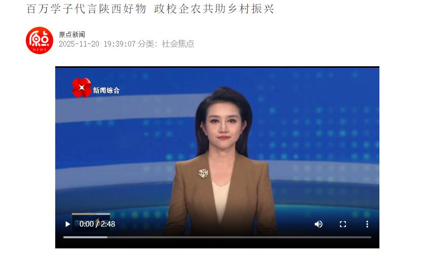 【原点新闻】百万学子代言陕西好物 政校企农共助乡村振兴:https://yuandian.xiancity.cn/application/fcinformation/mobile/#/ArticleDetail/885251/undefined