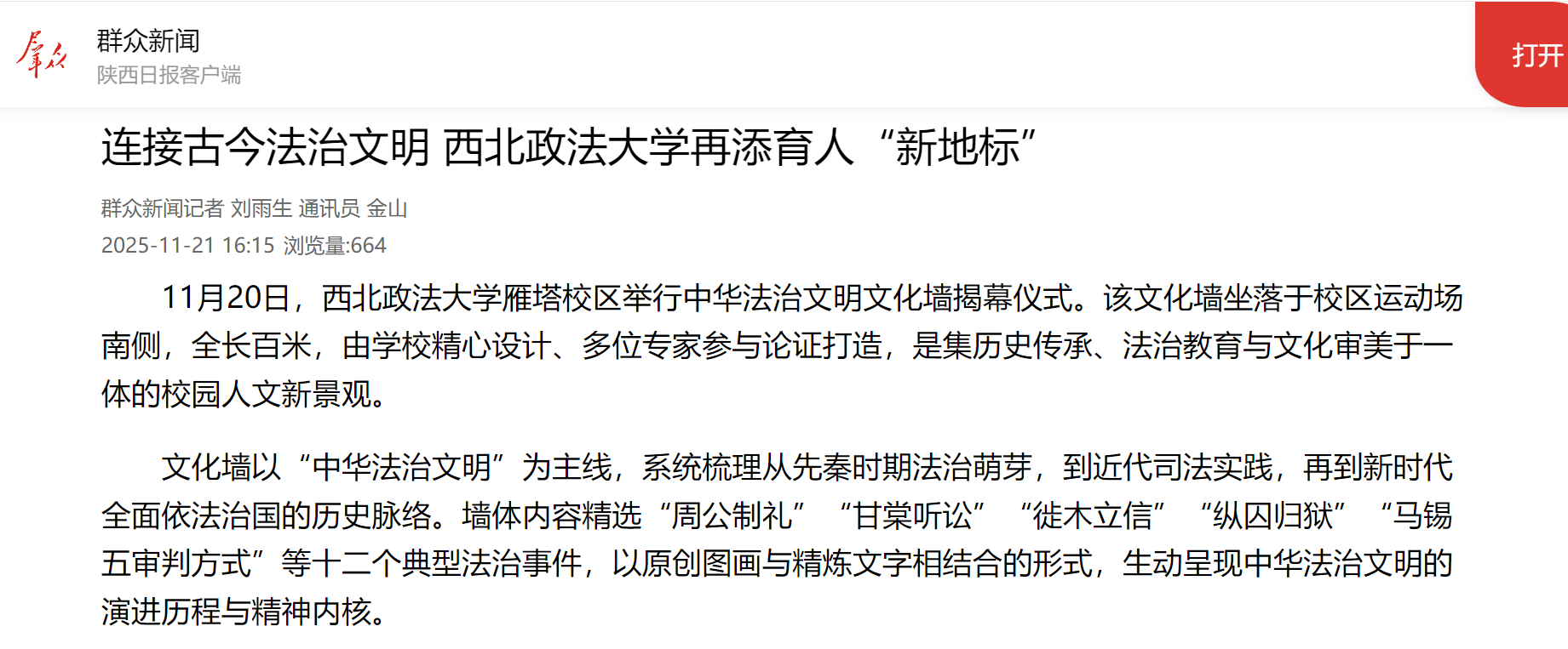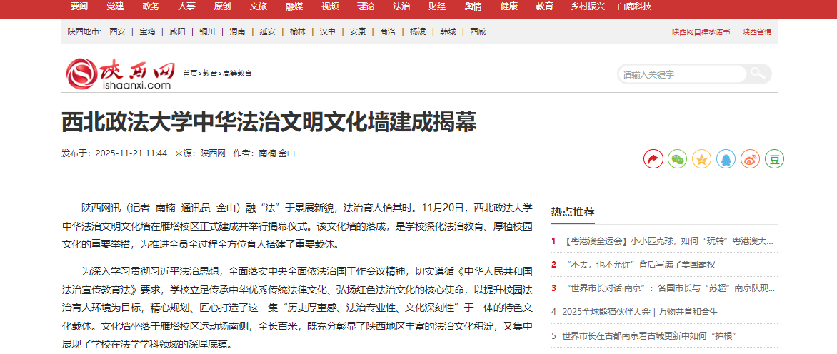 11月20日,西北政法大学雁塔校区举行中华法治文明文化墙揭幕仪式。该文化墙坐落于校区运动场南侧,全长百米,由学校精心设计、多位专家参与论证打造,是集历史传承、法治教育与文化审美于一体的校园人文新景观。 文化墙以“中华法治文明”为主线,系统梳理从先秦时期法治萌芽,到近代司法实践,再到新时代全面依法治国的历史脉络。墙体内容精选“周公制礼”“甘棠听讼”“徙木立信”“纵囚归狱”“马锡五审判方式”等十二个典型法治事件,以原创图画与精炼文字相结合的形式,生动呈现中华法治文明的演进历程与精神内核。 揭幕仪式现场,法治学院院长陈玺以文化墙为实景课堂,为师生讲授了一堂生动的法治思政课。他沿着墙体展陈内容,从传统法律文化讲起,串联起数千年法治变迁,阐释其当代意义,使法治教育更加具象化、情境化。 据悉,该文化墙不仅注重内容的历史厚重感与专业性,也在环境营造上融入巧思。墙下搭配绿植与花卉,使法治故事与自然景致相映成趣,在庄重中增添灵动,成为校园中一道兼具教育功能与观赏价值的文化风景,让师生在日常中潜移默化地接受法治文化熏陶。 文化墙的建成,是西北政法大学推动法治文化传播与校园环境融合的重要举措,也为弘扬法治精神、增强学科自信提供了新的载体。(群众新闻记者 刘雨生 通讯员 金山)