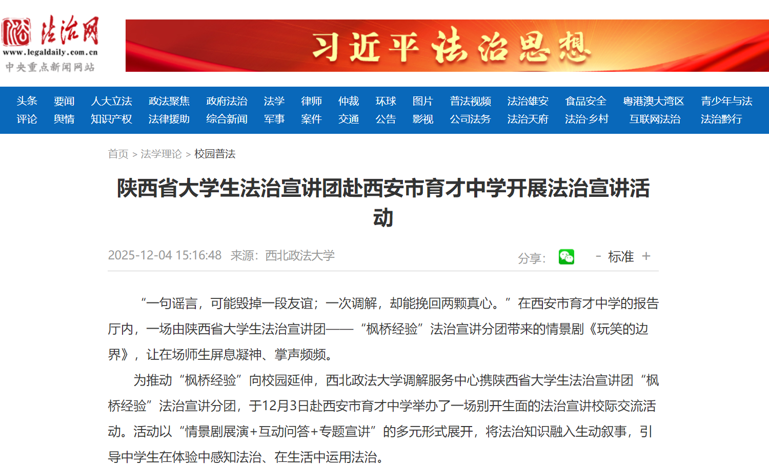 【法治网】陕西省大学生法治宣讲团赴西安市育才中学开展法治宣讲活动http://www.legaldaily.com.cn/fxjy/content/2025-12/04/content_9301219.html