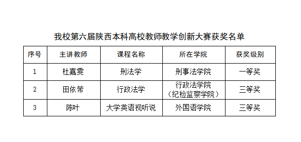 近日,由陕西省教育厅主办、西北工业大学承办的第六届陕西本科高校教师教学创新大赛落下帷幕。经过层层筛选和激烈角逐,我校刑事法学院杜嘉雯教师团队荣获一等奖,行政法学院(纪检监察学院)田依芾教师团队、外国语学院陈叶教师团队荣获三等奖。