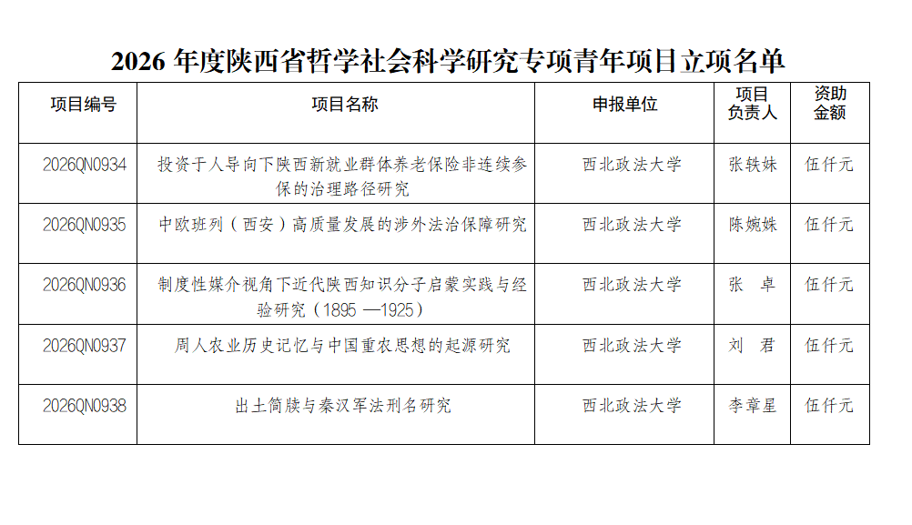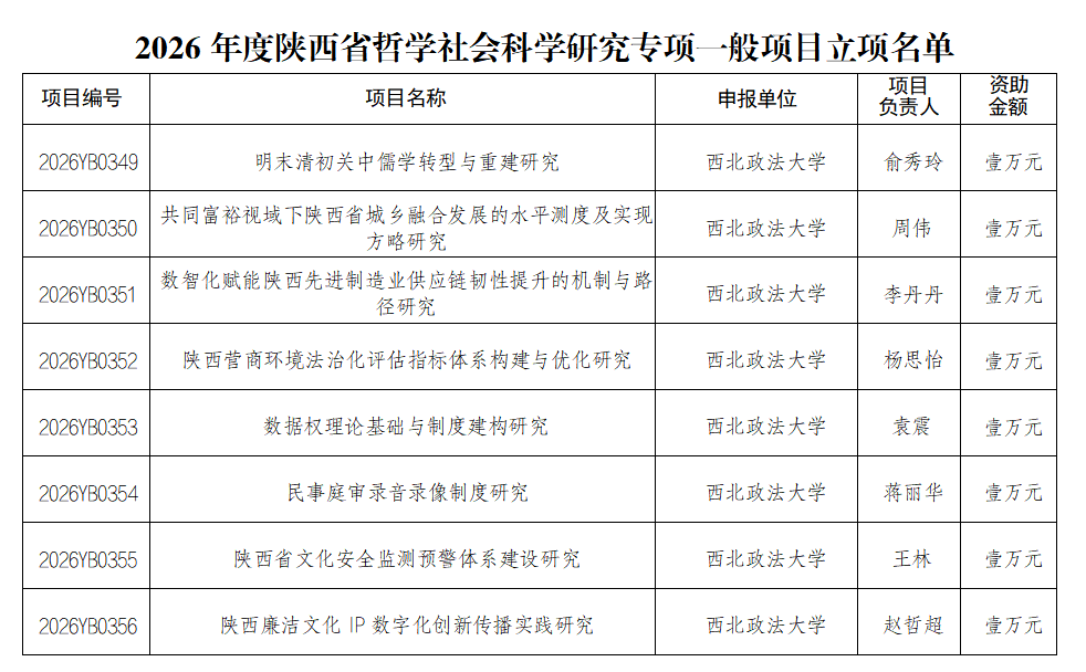 近日,陕西省社会科学界联合会正式公布2026年度陕西省哲学社会科学研究专项一般项目、青年项目立项结果,我校共有13项课题获批立项,其中一般项目8项、青年项目5项。