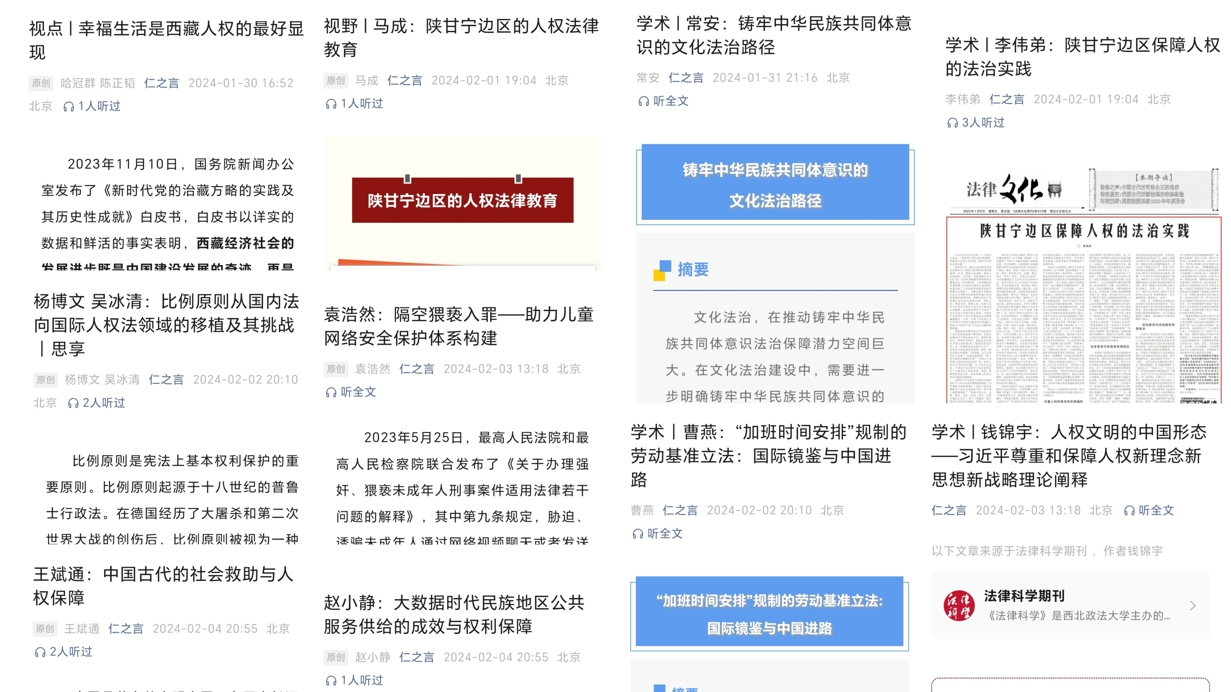 我校人权研究中心率先响应,积极组织各专、兼职研究员关注时事热点,结合自身研究领域,撰写原创文章。参与2024年1月30日—2月4日“仁之言”微信公众号为期一周的内容提供,集中推送我校原创文章及学术论文共10篇,分享学术观点,扩大学校影响力,获得良好效果。人权研究中心将持续关注国际国内时事热点,深耕学术土壤,不断为中国人权事业新发展新成就发声。