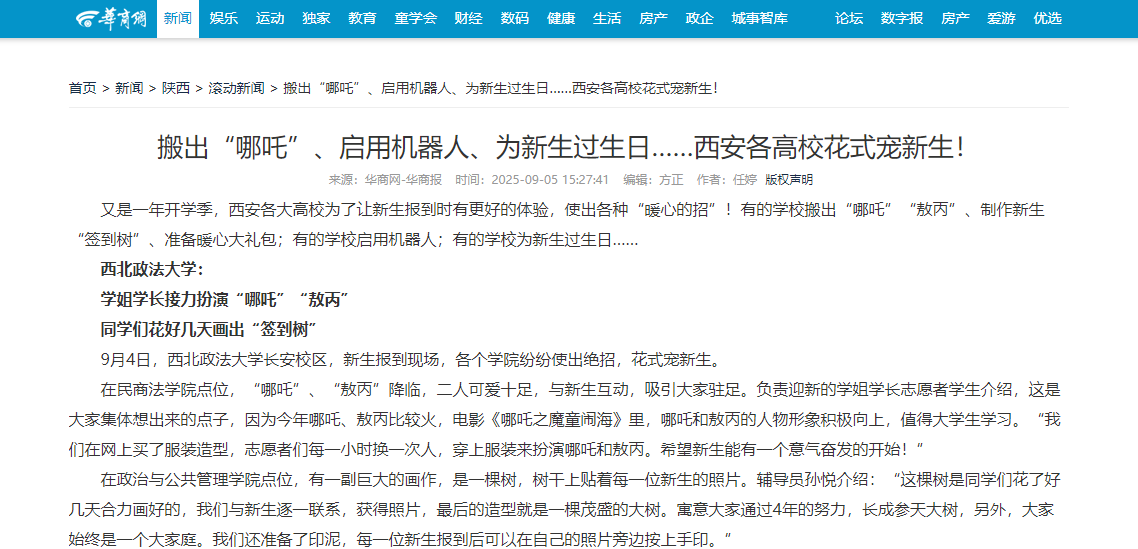 【华商报】搬出“哪吒”、启用机器人、为新生过生日……西安各高校花式宠新生!http://ehsb.hspress.net/shtml/hsb/20250905/727541.shtml