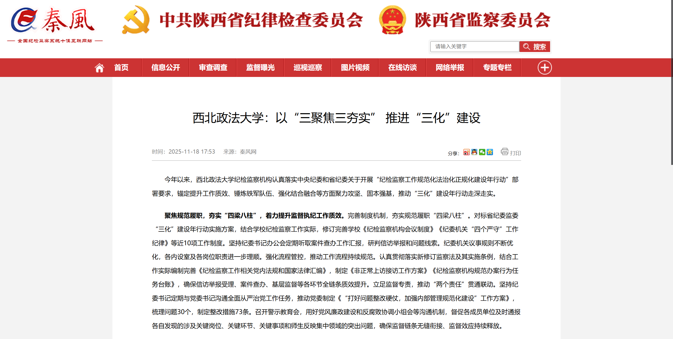 今年以来,西北政法大学纪检监察机构认真落实中央纪委和省纪委关于开展“纪检监察工作规范化法治化正规化建设年行动”部署要求,锚定提升工作质效、锤炼铁军队伍、强化结合融合等方面聚力攻坚、固本强基,推动“三化”建设年行动走深走实。