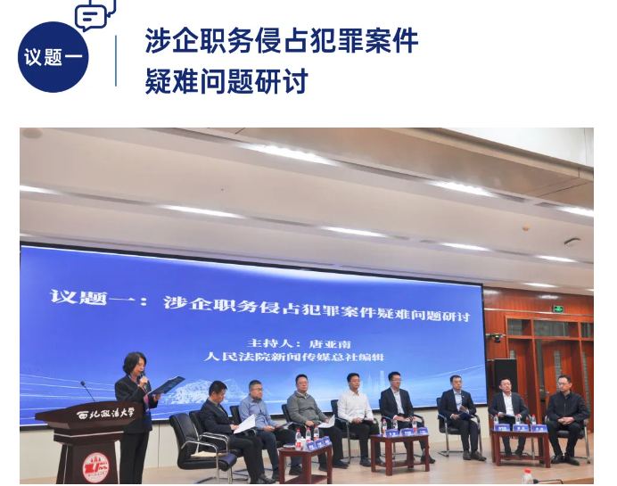 该议题由人民法院新闻传媒总社编辑唐亚南主持,西安市公安局经侦支队支队长罗小刚,西安市检察院第四检察部检察官孙佰明,上海市检一分院第三检察部副主任朱峰,上海市律协刑法与刑事辩护专业委员会委员、泰和泰律师事务所刑事法律中心主负责人刘华锋,西安中院刑二庭法官李金阳,上海一中院刑庭审判长于书生,西北政法大学刑事法学院副院长、教授谭堃围绕“公司股东将其实际控制的关联公司本应支付给本公司的资金予以转移,是否构成职务侵占罪”“业务合作中合作方人员利用本公司委托授权、经手本公司资金的便利截留本公司应当收取的资金,是否构成职务侵占罪”“个体工商户员工截留营业款的行为如何定性”等问题展开研讨。上海市金山区人民法院党组书记、院长余剑发表与谈意见。