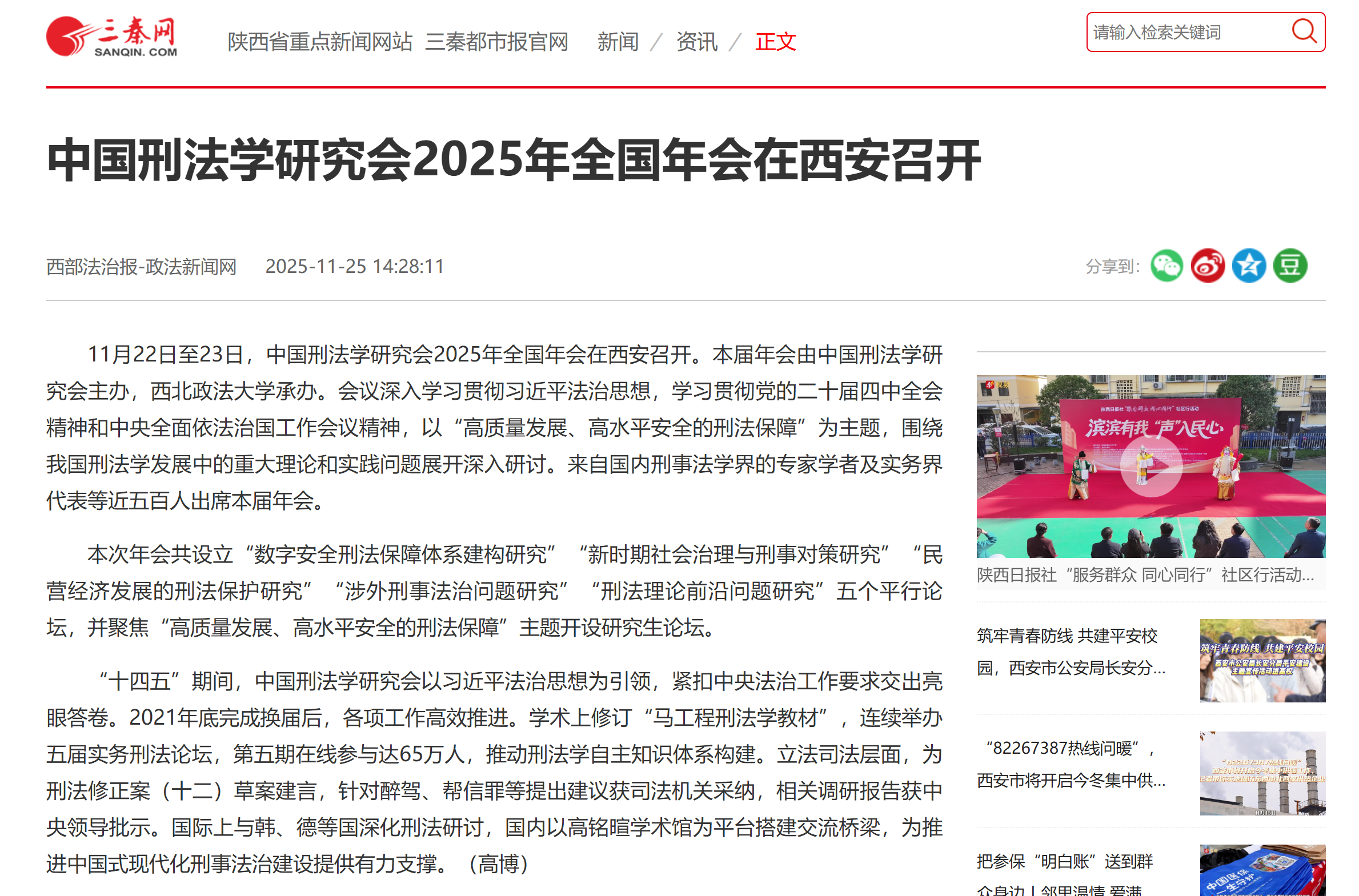 【中国日报网】中国刑法学研究会2025年全国年会在西安召开 共探刑法保障新路径https://shx.chinadaily.com.cn/a/202511/25/WS69251f7ca310942cc4993296.html