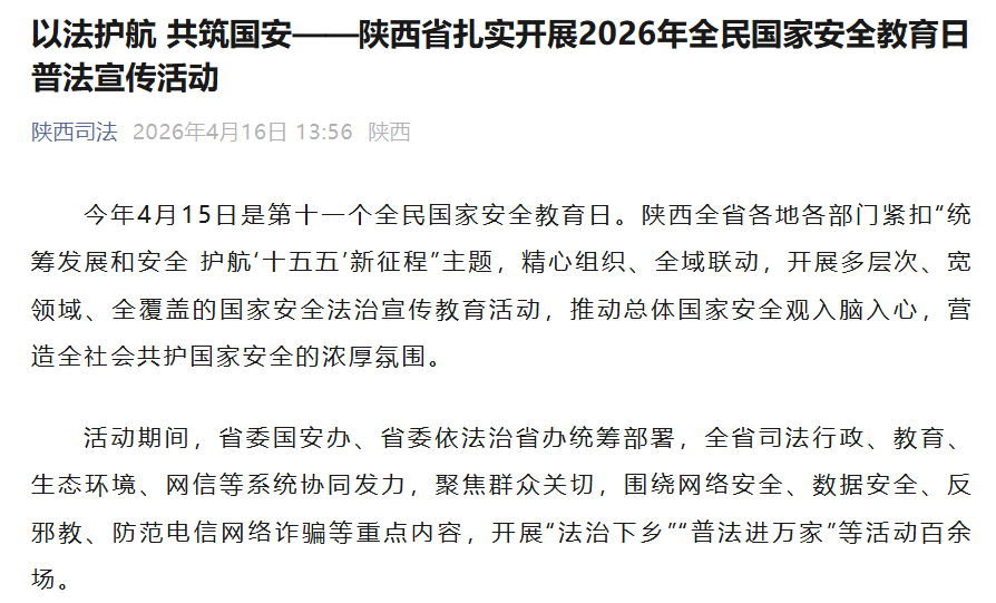 今年4月15日是第十一个全民国家安全教育日。陕西全省各地各部门紧扣“统筹发展和安全 护航‘十五五’新征程”主题,精心组织、全域联动,开展多层次、宽领域、全覆盖的国家安全法治宣传教育活动,推动总体国家安全观入脑入心,营造全社会共护国家安全的浓厚氛围。