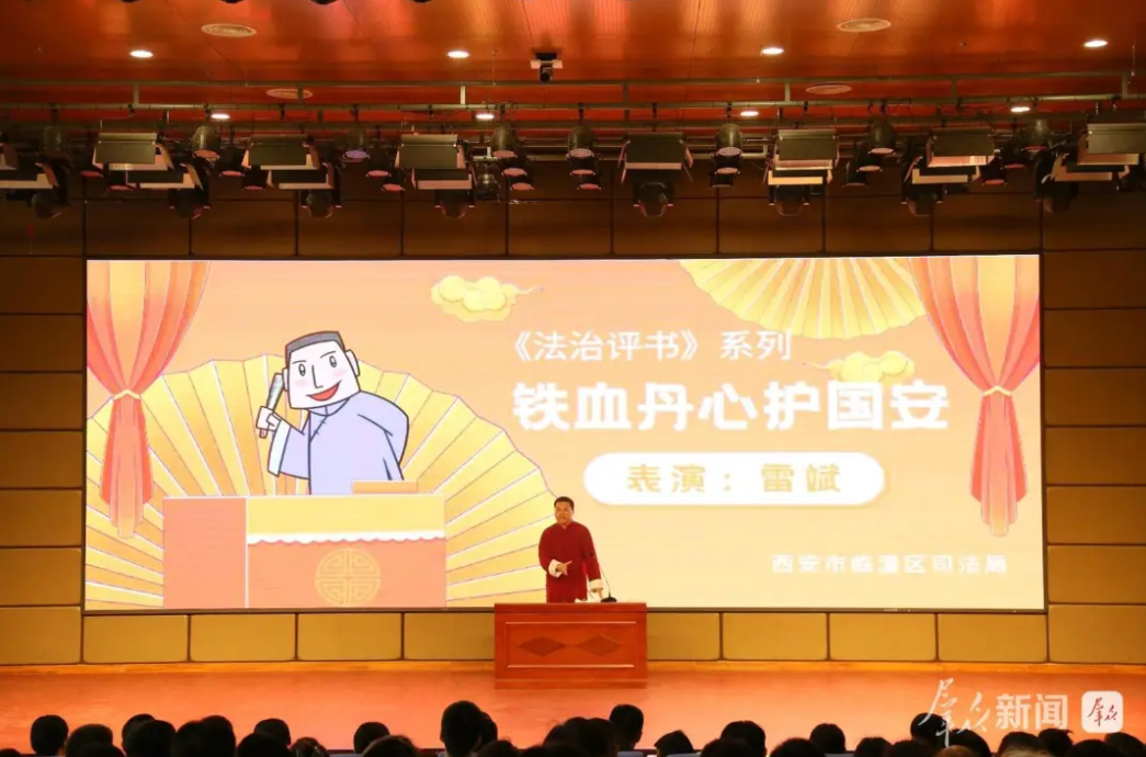 4月14日,西安市全民国家安全教育日暨保密宣传月启动活动上,司法行政干警自创并表演评书《铁血丹心护国安》。