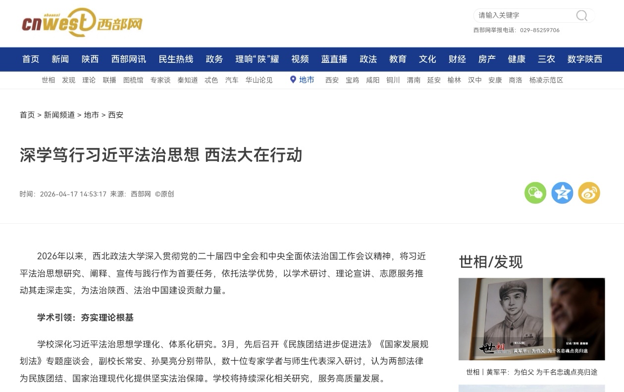 2026年以来,西北政法大学深入贯彻党的二十届四中全会和中央全面依法治国工作会议精神,将习近平法治思想研究、阐释、宣传与践行作为首要任务,依托法学优势,以学术研讨、理论宣讲、志愿服务推动其走深走实,为法治陕西、法治中国建设贡献力量。