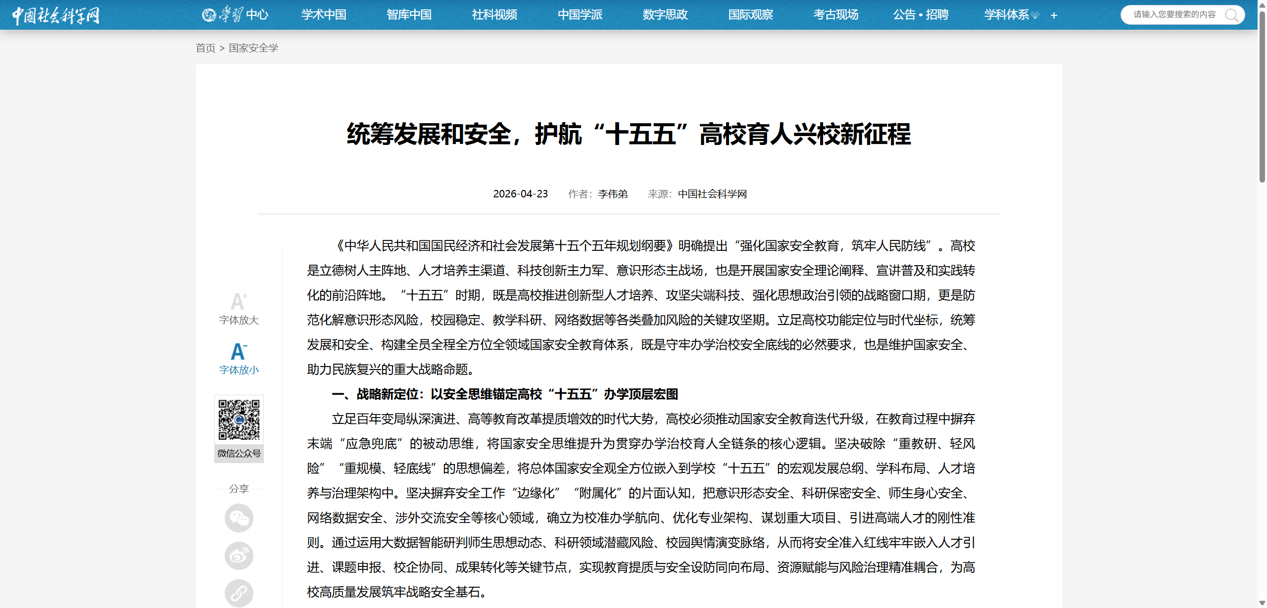 《中华人民共和国国民经济和社会发展第十五个五年规划纲要》明确提出“强化国家安全教育,筑牢人民防线”。高校是立德树人主阵地、人才培养主渠道、科技创新主力军、意识形态主战场,也是开展国家安全理论阐释、宣讲普及和实践转化的前沿阵地。“十五五”时期,既是高校推进创新型人才培养、攻坚尖端科技、强化思想政治引领的战略窗口期,更是防范化解意识形态风险,校园稳定、教学科研、网络数据等各类叠加风险的关键攻坚期。立足高校功能定位与时代坐标,统筹发展和安全、构建全员全程全方位全领域国家安全教育体系,既是守牢办学治校安全底线的必然要求,也是维护国家安全、助力民族复兴的重大战略命题。