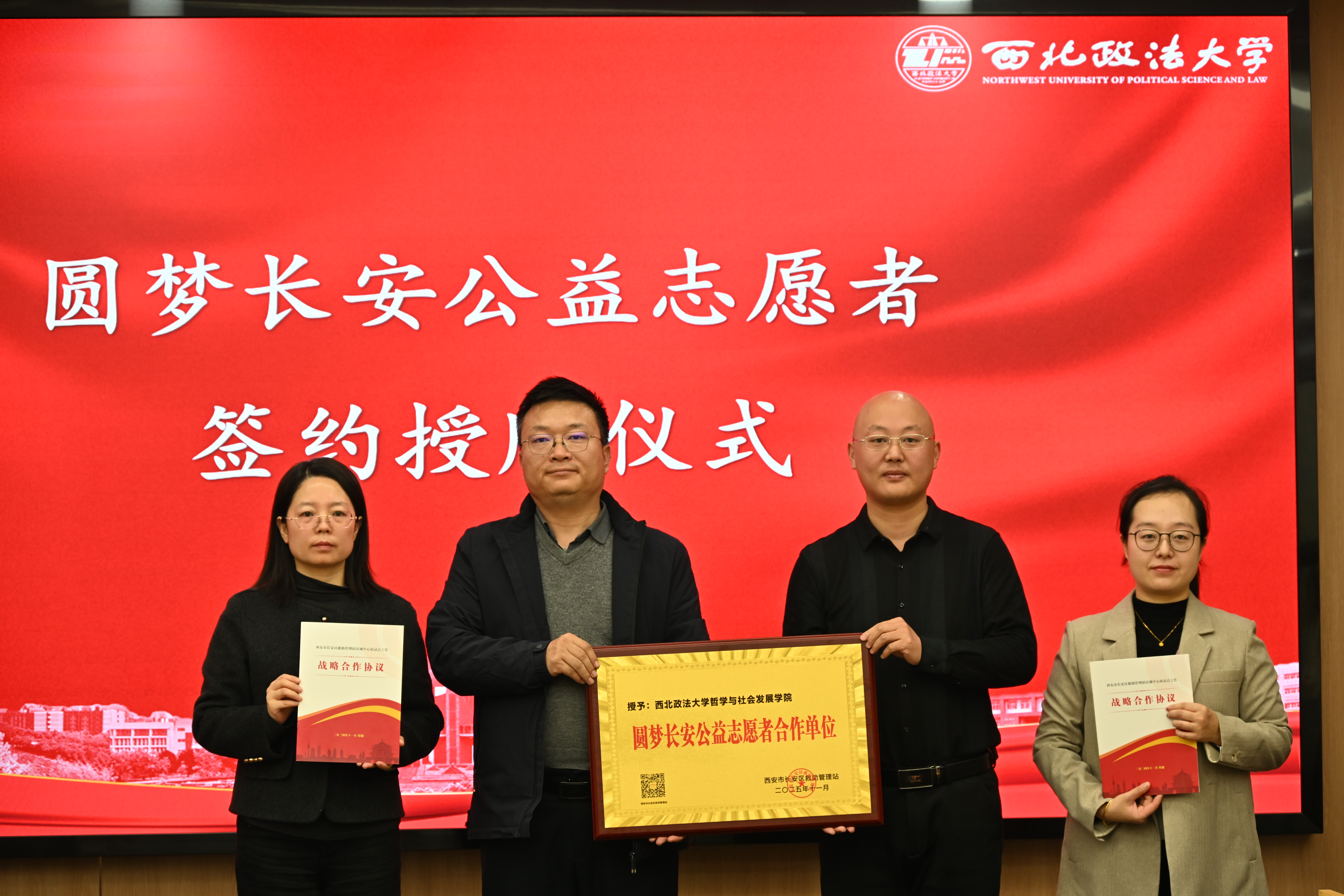 11月12日,哲学与社会发展学院与长安区救助管理站“圆梦长安公益志愿者”签约授牌仪式在长安校区举行。长安区救助管理站副站长肖栋、办公室主任陈焱,哲学与社会发展学院党委副书记、副院长杨军及20名学生志愿者共同参与,学院团委书记慕婧主持仪式。