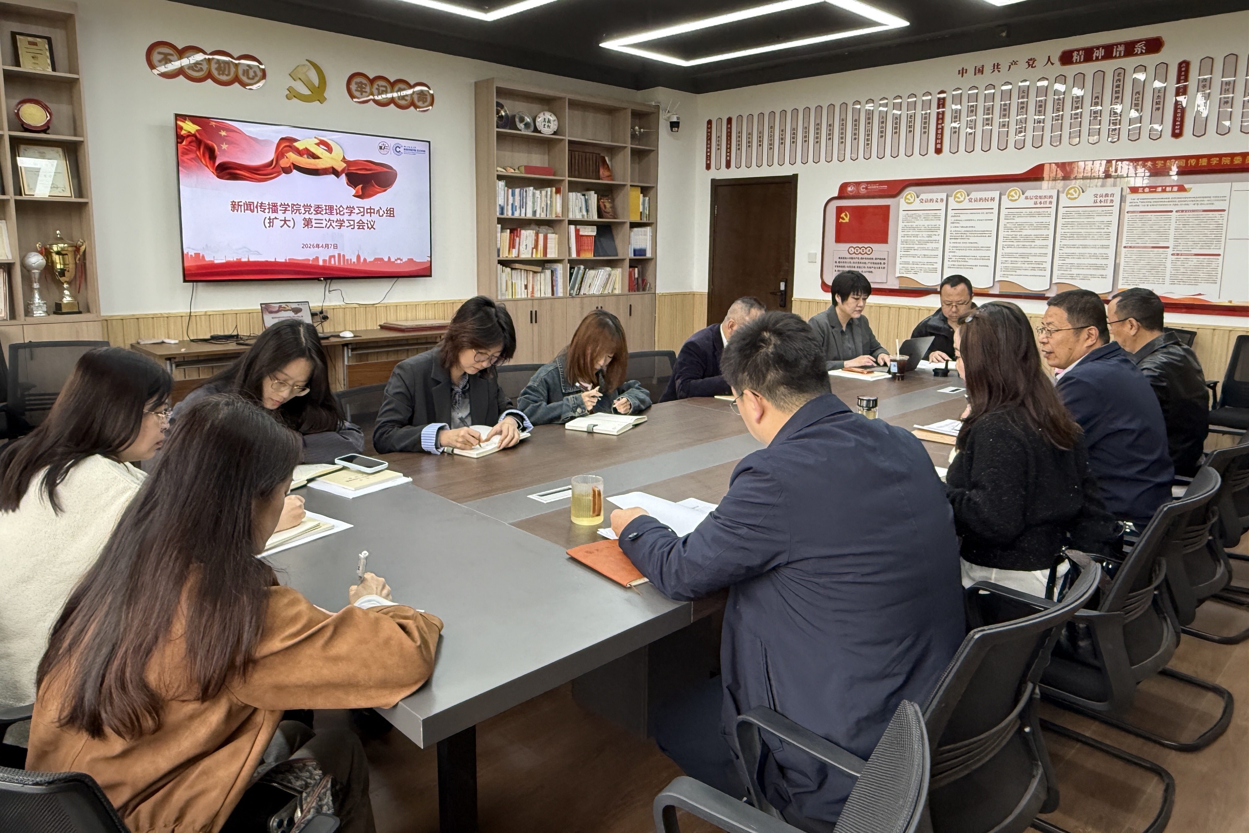 4月7日,新闻传播学院党委在致知楼党员活动室开展理论学习中心组(扩大)学习会议。学院领导班子成员、各党支部书记参加会议,学院党委书记王森主持会议。