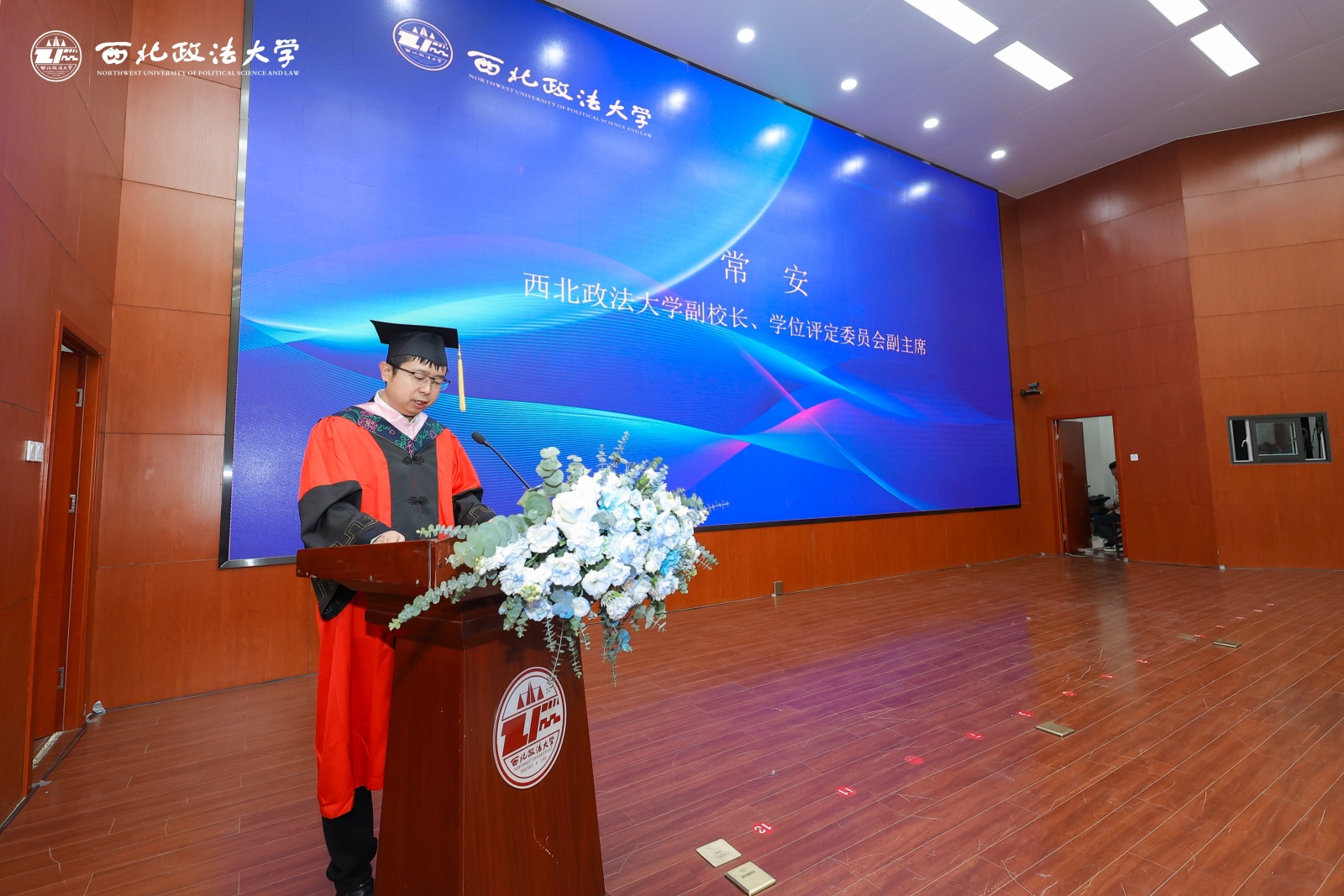 学位授予仪式由法治学院 法律硕士教育学院副院长李霞主持。常安宣读《关于授予刘晓峰等75名毕业生学位的决议》,并与陈玺共同为学位获得者拨流苏、颁发学位证书。