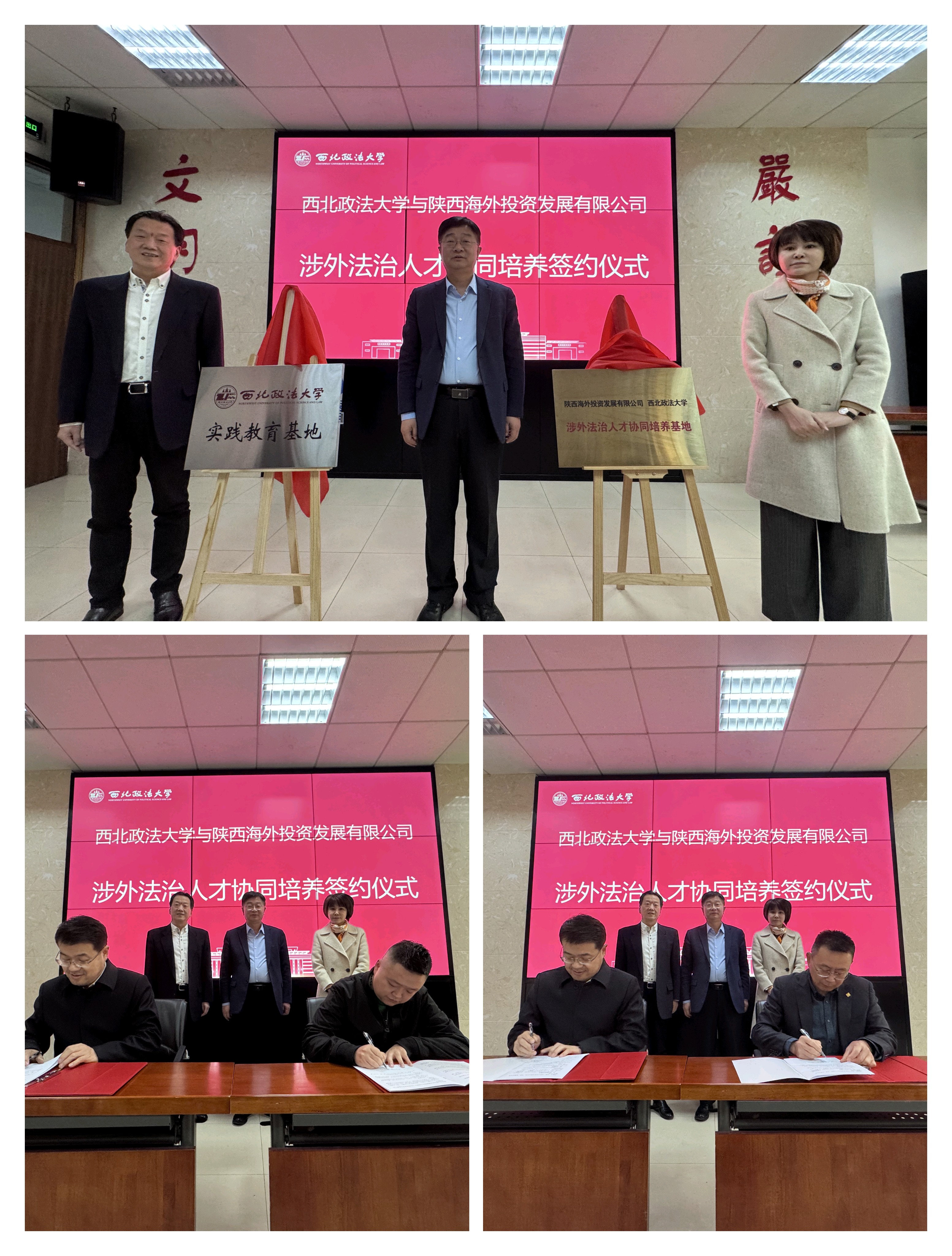 范九利、王东红共同为“西北政法大学实践教育基地”及“涉外法治人才协同培养基地”揭牌。张荣刚与陕西海外投资发展有限公司副总经理冯晓旭、陕西金泰多元工贸有限公司总经理徐宾签署战略合作协议。
