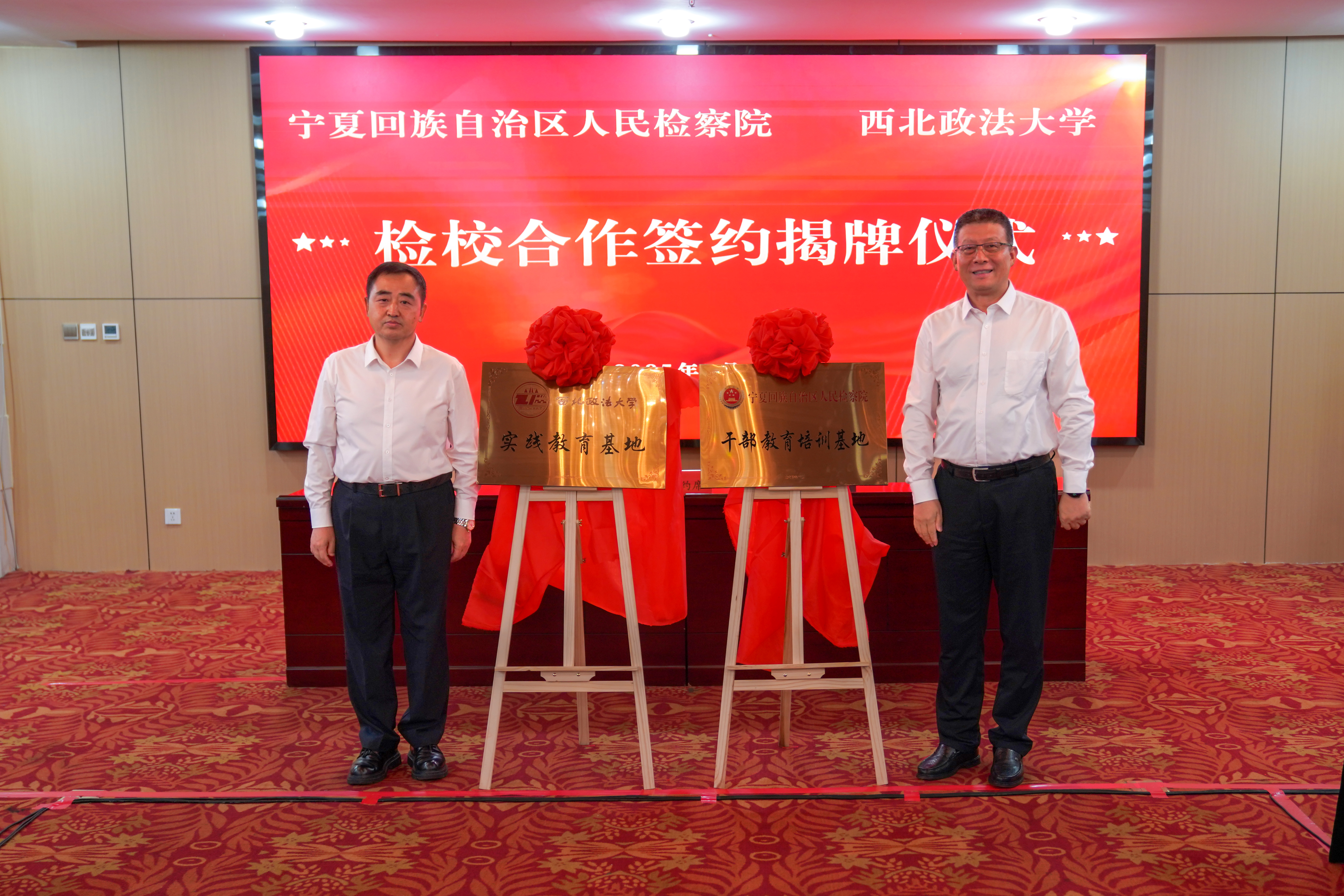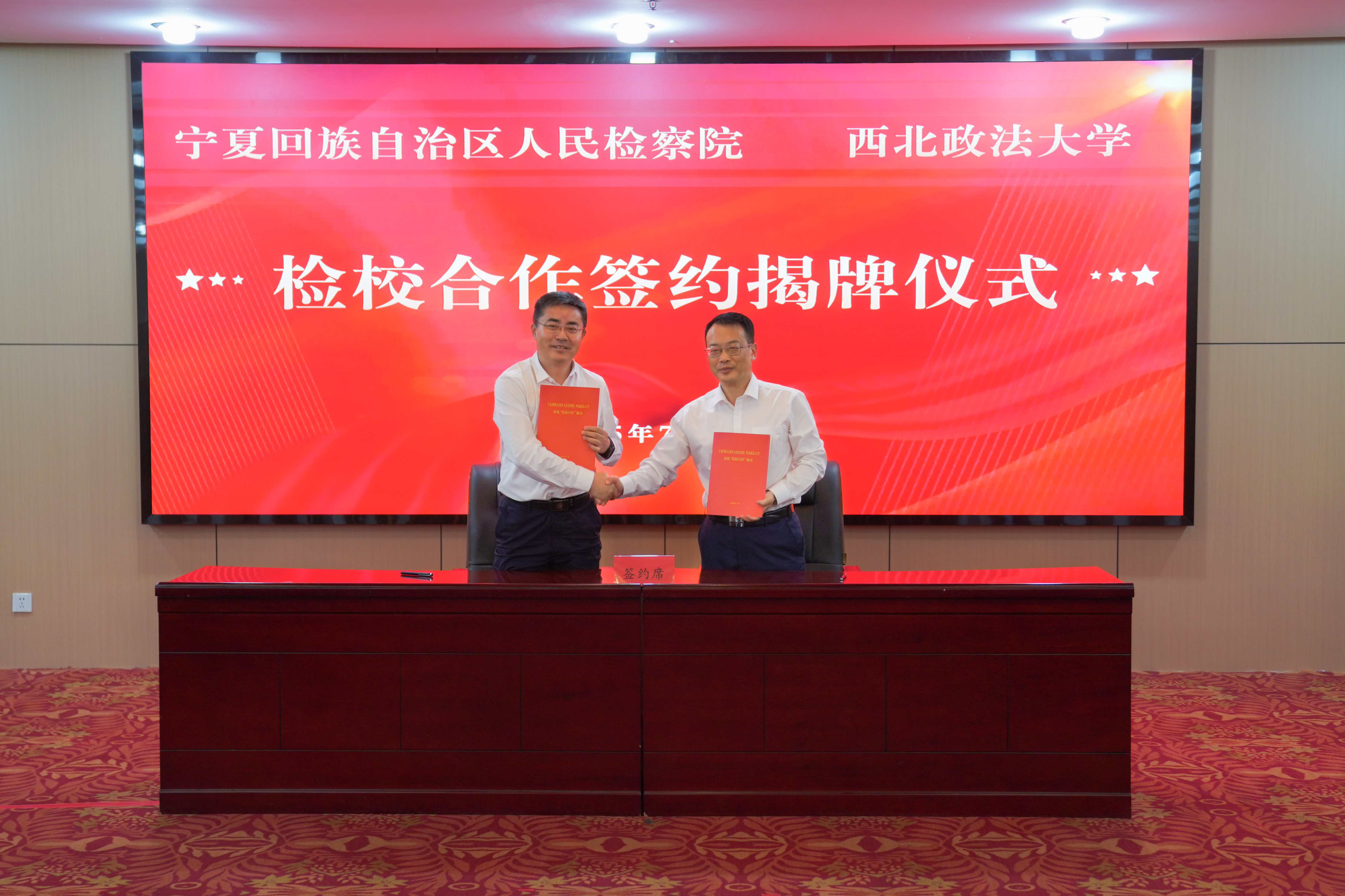 7月21日上午,宁夏回族自治区人民检察院与我校在银川举行“检校合作”签约暨揭牌仪式。自治区检察院党组书记、检察长窦朝晖,党组副书记、副检察长马剑勇,自治区党委政法委副书记罗时文,我校党委书记赵万东、副校长赵全宇出席,仪式由自治区检察院党组成员、政治部主任王海峰主持。