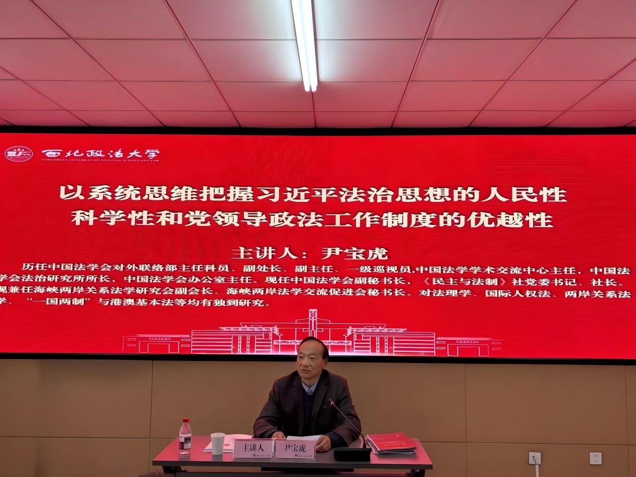 尹宝虎为师生作了题为“以系统思维把握习近平法治思想的人民性、科学性和党领导政法工作制度的优越性”的专题讲座。他深入阐释了习近平法治思想的系统思维与人民性、科学性,指出系统法学是推进全面依法治国的重要方向。与谈人张荣刚、王国龙围绕讲座主题深入阐述了各自的观点,并与主讲人进行了积极的交流互动。