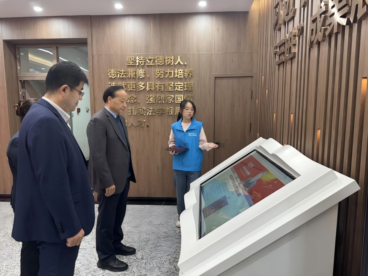 讲座前,考察组一行参观了习近平法治思想“三进”成果展室。民商法学院负责同志参加调研活动。