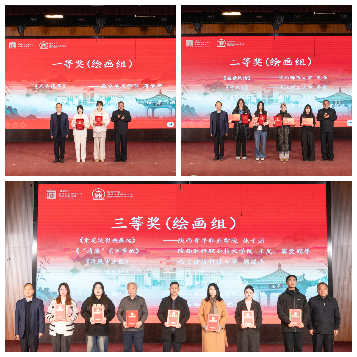 西安外国语大学党委副书记、纪委书记、省纪委监委驻校纪检监察组组长姜劲波与西安邮电大学党委副书记、纪委书记、监察专员张秦安共同为绘画组优秀作品颁奖